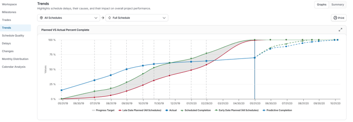 The View Trends section in the Analysis Tab opens a dynamic report showing how key project metrics evolve over time. It is a visual way to monitor progress, risks, and schedule health across schedule updates.