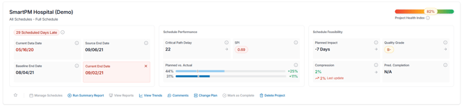 In Card View, your projects are displayed as individual cards that highlight key details at a glance. Each card includes important dates, schedule performance, and an up-to-date assessment of schedule feasibility based on the latest data date.