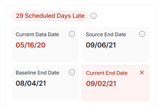 - Planned Impact: The total change to the project’s end date caused by updates to the planned schedule to date.