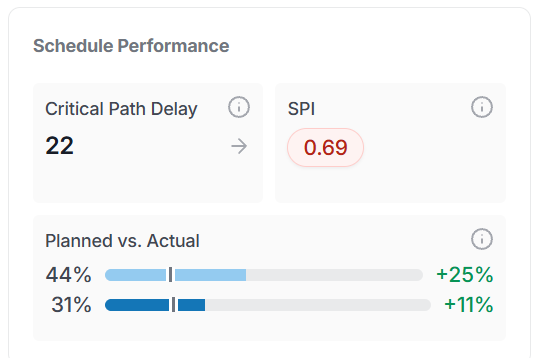 Schedule Performance provides insight into how your project is tracking against the plan: