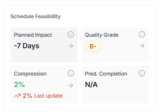 - Quality Grade: An assessment of the project schedule’s structural integrity, based on Critical Path Method (CPM) best practices.