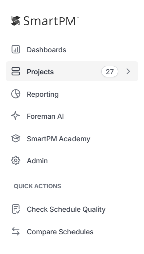 Use the Global Navigation Menu to quickly access different SmartPM features. The Global Navigation Menu can be accessed from any screen in SmartPM by clicking on the icons on the left hand side.