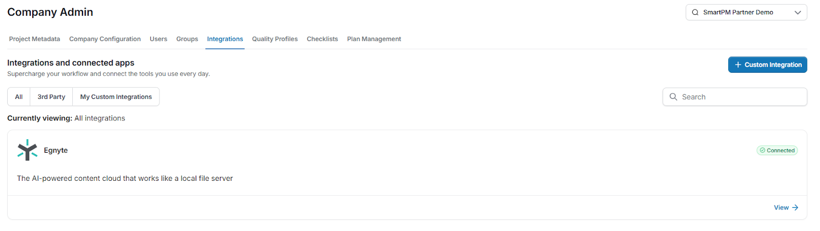 - Find and Open the Egnyte Integration. Locate the Egnyte card and click View → at the bottom right of the card. A side panel will appear with details about connecting SmartPM to Egnyte