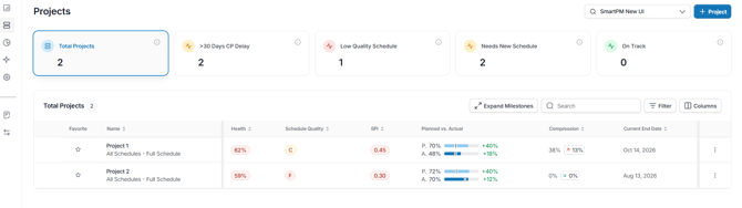 SmartPM 2.0 introduces a modernized, more intuitive interface, while keeping all your projects, schedules, analytics, and permissions exactly as they were. This update focuses on simplifying navigation, organizing tools more logically, and giving you a more flexible way to view your portfolio.