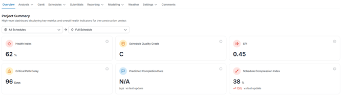 The Overview tab gives you a snapshot of project health, including:
