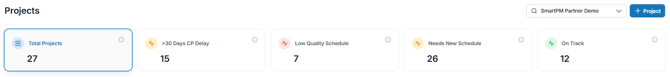 At the top of the Project List, you’ll see a portfolio overview that summarizes all projects. This includes counts of projects that are delayed, low quality, require new schedules, or are on track. Clicking any metric filters the project list to show only those projects.