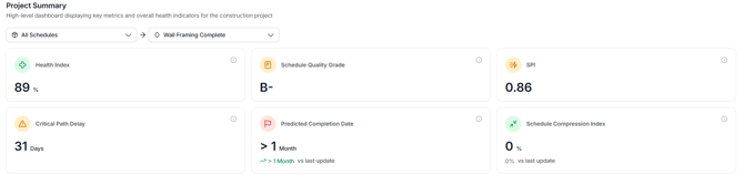High-level dashboard displaying key metrics and overall health indicators for the construction project. |