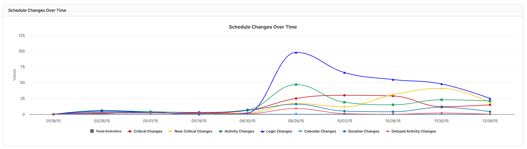 - The Schedule Changes Over Time graph will display the number of changes made between schedule updates. They are broken out by types: