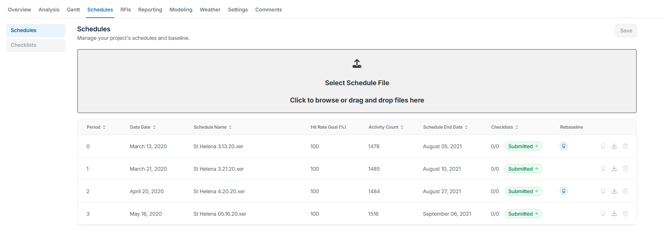 • Schedule Repository: Stores every uploaded schedule file (.xer, .mpp, etc.) in sequential order by update period.