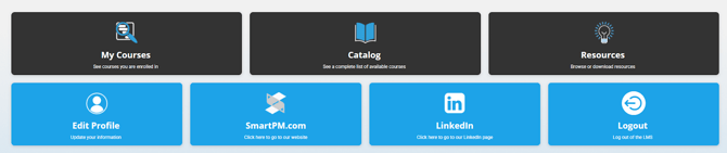 Towards the top of SmartPM Academy, you'll find Quick Action Buttons for managing your profile, your courses, accessing resources, and navigating to external SmartPM links.